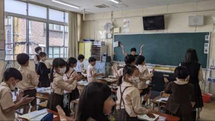 先生と子どもたちが、音楽に合わせて、手や足でリズムをとっていました。