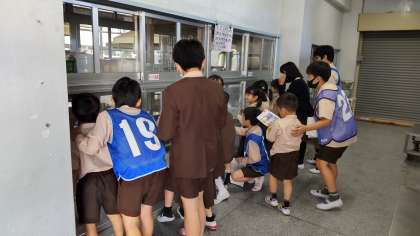 ここは給食室です。どのようにして給食ができあがるのか、興味津々で見ています。