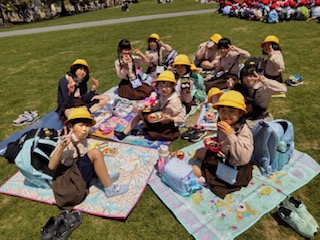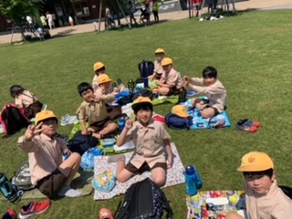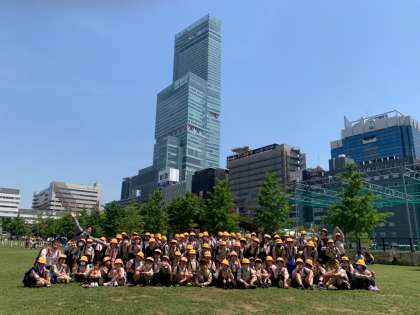 てんしばで、お弁当を食べ、鬼ごっこなどをして遊びました。あべのハルカスをバックに、みんなで写真を撮りました。