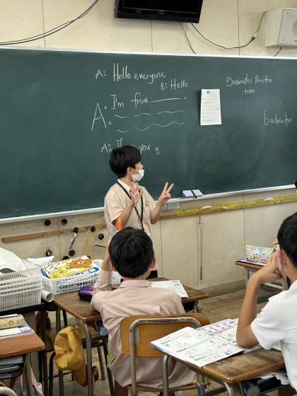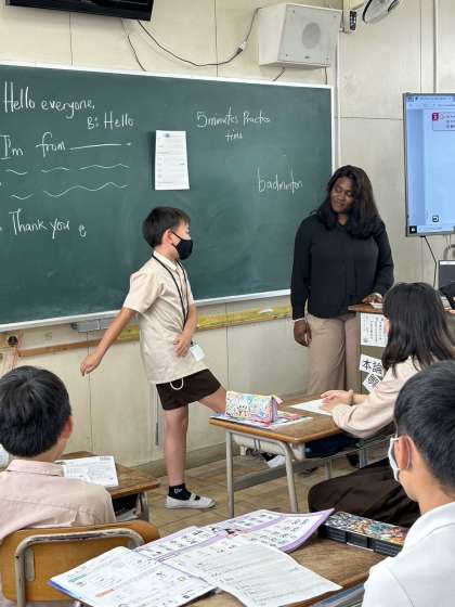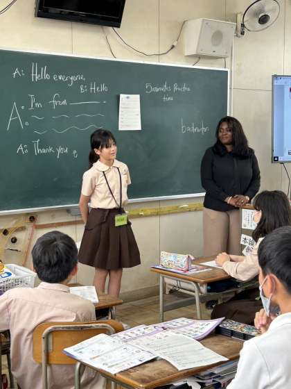 一人一人英語で、好きなものや得意な事、誕生日など自己紹介をしました。友達が話した後は、「good job」と声をかけてあげていました。
