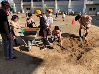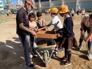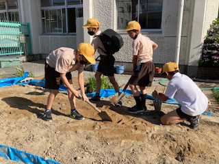 登校時も下校時もみんなで一生懸命土づくりをしている5年生。田植えまでにもたくさんの工程があることを体験を通して学んでいます。