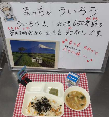 今日は、かやくご飯、みそ汁、抹茶ういろう、牛乳でした。給食委員会の放送では三年生で学習する「茶つみ」の歌を歌い新茶の季節に手作りした和菓子の紹介もしました。
