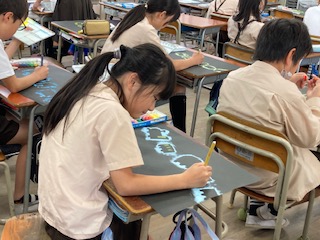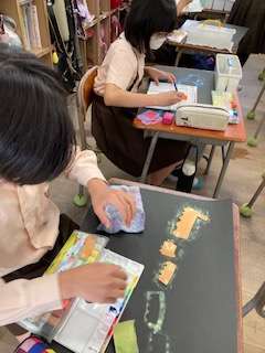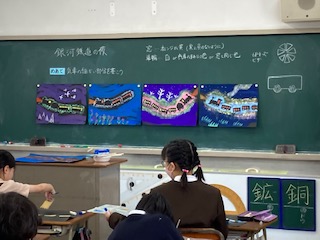 列車の細かい部分をスポンジや筆などを使って工夫して表現しました。