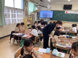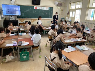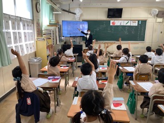 しりとりをしました。ルールを確認し、グループでどれだけたくさん言葉を繋げることができるか競争をしました。たくさんの言葉を知っていは子どもたち。とても楽しかったと、振り返りも発表できました。