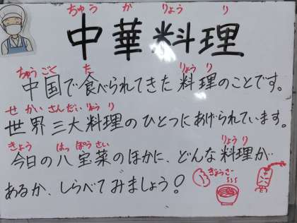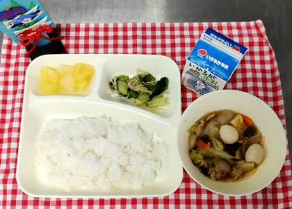 今日は八宝菜、チンゲンサイともやしのしょうがあえ、パインアップル(缶詰)、ご飯、牛乳でした。八宝菜はうずら卵除去食も用意しました。