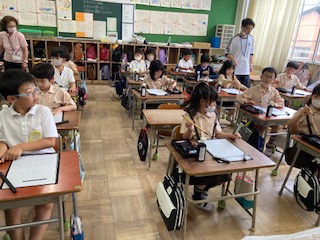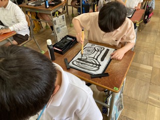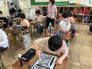 今日は、初めての書写の学習です。道具の説明や使い方を聞いた後、太筆で太い線、細い線などを書きました。筆を押さえる力を強くすると太い線が書けることに気づきました。
