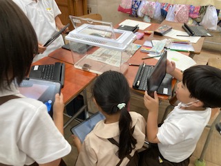 野菜の病気についてや育て方について、インターネットで調べました。また、自分の野菜の写真を確認したり、飼っているカメの観察をしたりしました。