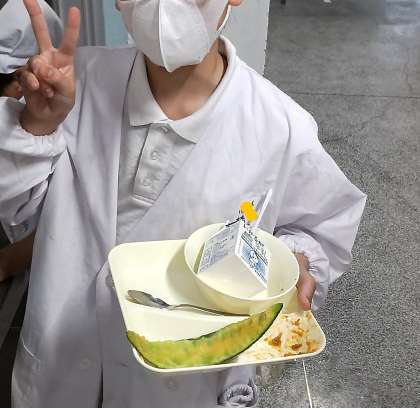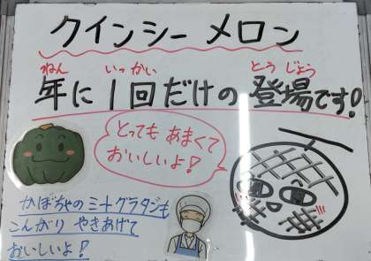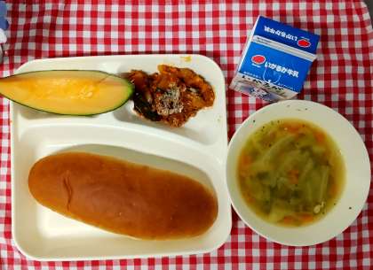 今日は、かぼちゃのミートグラタン、豚肉と野菜のスープ、クインシーメロン、黒糖パン、牛乳でした。人気のグラタンは給食室の手作りです。年一回のメロンは赤肉で甘く好評でした。「こんなにきれいに食べたよ。」と見せてくれましたよ。