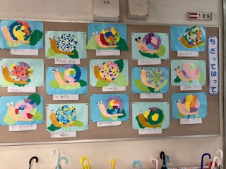 思い思いの色や形に色画用紙を切ったり貼ったりして、カタツムリを表現しています。廊下や教室に掲示しています。参観時にご覧ください。