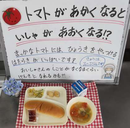 今日は、いかてんぷら、フレッシュトマトのスープ煮、キャベツとコーンのソテー、コッペパン、いちごジャム、牛乳でした。