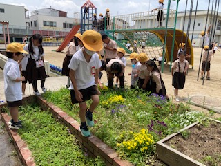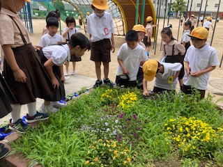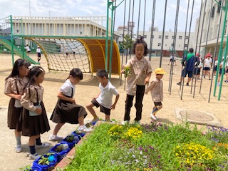 教室前の花壇のパンジー、ビオラももうそろそろ終わりです。でもそこに赤と黒の毛虫が!見つけたのは1年のBさん。他にもいないかみんなで探しました。4匹見つかりました!