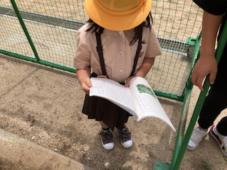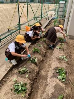 さつまいもの苗を植えました。国語科では、ちょうど「さつまいもの育て方」を学習しています。苗をどんなふうに土の中に入れたら良いか、教科書を調べました。