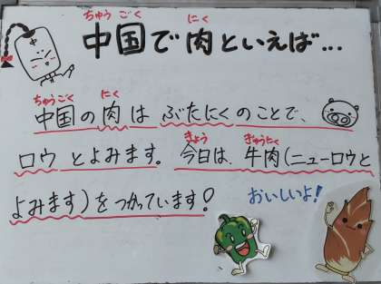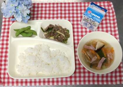 今日は、チンジャオニューロウスー、ハムと野菜の中華スープ、枝豆、ご飯、牛乳でした。