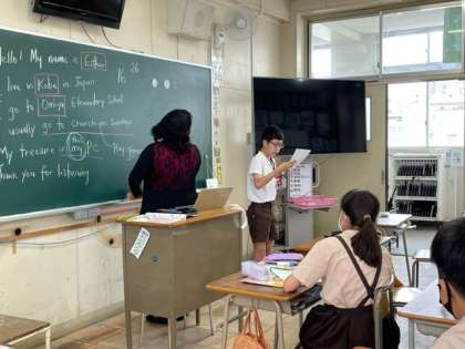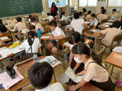 C-NETの先生が作成したクイズでウォーミングアップをした後、プリントに紹介文を書き、スピーチの練習をしました。ペアをかえながら、何度も繰り返して練習をしています。