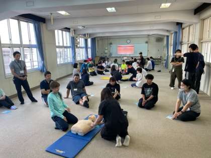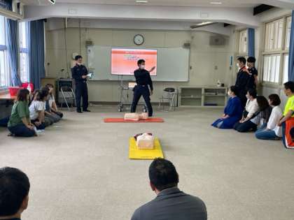 消防署の方々に来ていただき、心肺蘇生の仕方やAEDの使い方の練習をしました。
