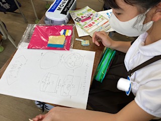 フェルト布を使って小物を作ります。自分が作りたいものを設計図に書き、型紙を取って布をカット。かがり縫いに挑戦します。どんな作品ができるかな。楽しみですね。
