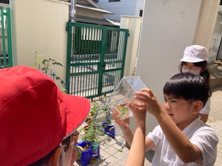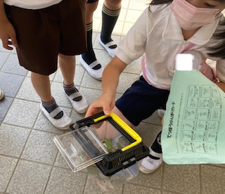パンジーの花壇で見つけたツマグロヒョウモンの幼虫を育てていた2年生。さなぎになり、成虫になりました!ピロティでケースの蓋を開けると、元気に飛んでいきました!!