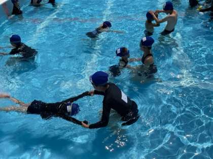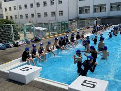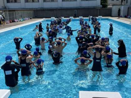 6年生が、小学校で初めてプールに入る1年生のために、体操や入水の仕方、水慣れなどを教えました。お兄さんお姉さんと一緒なので、1年生も安心してプールに入ることができました。