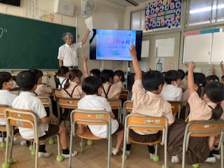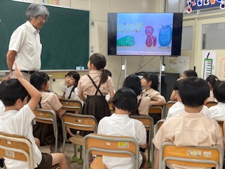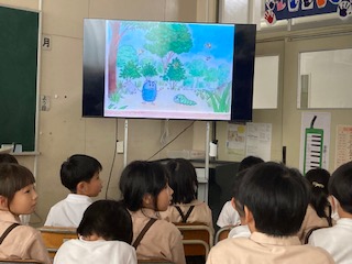 「ビオトープミニ物語」という紙芝居を視聴しました。ビオトープでのイモムシやミミズ、ダンゴムシ、大地の神様などが織りなす世界を子ども達なりに理解できたようです。アゲハチョウの幼虫はどれもみな、みかんの葉を食べるのではなく、アオスジアゲハは、クスノキの葉を食べるなど、それぞれ種類によって食べる葉っぱが違うこと、ぜんぶ食べつくしてしまわないことなどを学びました。、