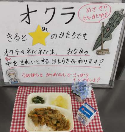 今日は、和風カレー丼、オクラのかつお梅風味、りんご(缶詰)、牛乳でした。
