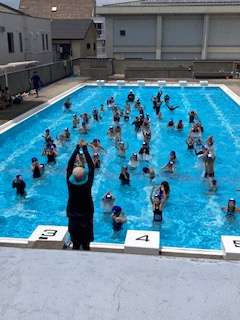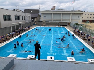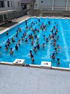 2年生は、今日がプール水泳初日です。ディズニーメロディに合わせて水中ダンスで水慣れの準備運動をしました。続いてけのび、ばた足を練習しました。