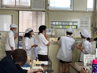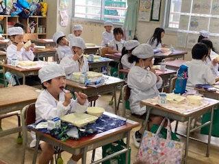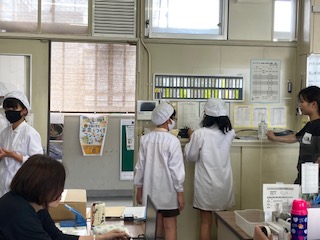 給食の時間、たてわり班の班長が、自分のグループの出し物の説明や宣伝をしました。