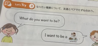 何になりたいかをたずねたり、答えたりするフレーズを覚えて使っていきました。