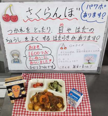 今日は、ハヤシライス、ミックス海そうのサラダ、さくらんぼ、牛乳でした。年に1回登場の生のさくらんぼは今が旬です。初めてさくらんぼを食べたという1年生も「美味しい」と喜んでいました。甘酸っぱいさくらんぼには梅雨時の疲れを癒してくれる働きがあります。