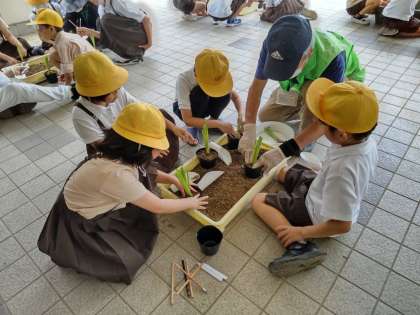 本校では、3年生が去年1年間、4年生が育てた菖蒲を受け継ぎ、株分けをして育てていく活動を10年以上続けています。