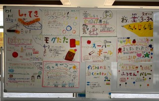 玄関にそれぞれの班のポスターが掲示してあります。給食中に、班長は出し物の宣伝をして「来てね!」と呼びかけました。