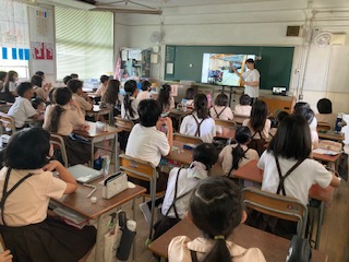 の話を聞いています。宿舎や活動の様子の写真を見て、今から楽しみにしています。