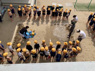 砂場で遊びました。水を流して泥団子をつくったり、穴を掘って水が流れる様子を見たりして遊びました。