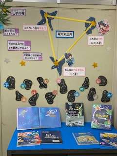 図書室前の掲示です。夏の夜空、ロマンを感じますね。関連の図書もたくさん揃えています!