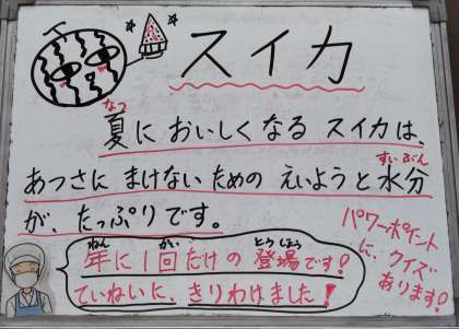 今日は、パエリア、ウインナーとキャベツのスープ、スイカ、コッペパン、牛乳でした。年に1回登場するスイカには、夏の暑さに負けない栄養と水分がたっぷりです。甘く熟れたスイカを調理員さんが64分の1切れに切り分けてくれました。