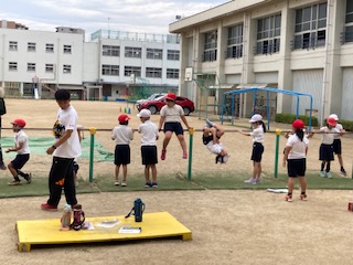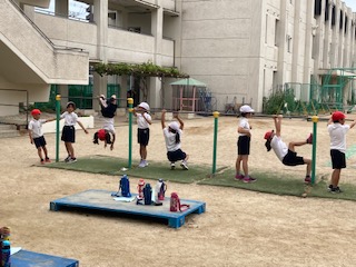 1学期学習した技を一通りさらいました。その後鉄棒のテストをしました。