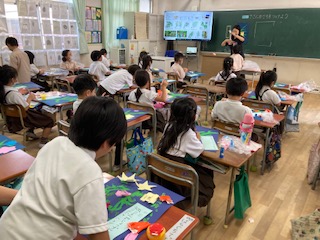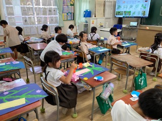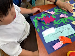 七夕の飾りを作りました。貝殻や星以外に自分の好きなものを作って飾っています。