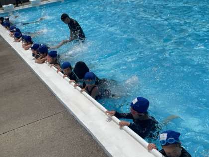 伏し浮き、バタ足の練習をして、プールの横の端から端まで泳ぎました。