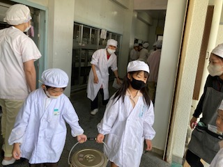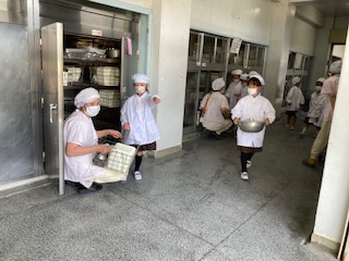 当番の子が給食調理員さんから手渡しで、食器やおかずなどをもらっています。「気をつけてね」とか「重いよ」などの声かけをしてもらっています。