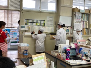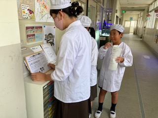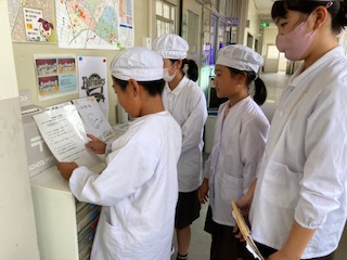 給食時間に献立や食材の話などを毎日放送しています。委員会の当番児童は、職員室前で練習をしてから本番に臨んでいます。