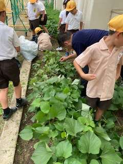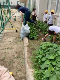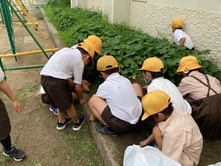 サツマイモが大きく育ってきました。雑草がたくさん生えてきたので、みんなで雑草引きをしました。「どうして雑草を取らないといけないの?」と尋ねると、「栄養を取られてしまうから」とすぐに答えが返ってきました。さすがですね!