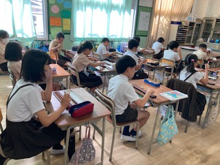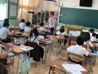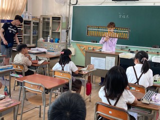 そろばんで大きな数や、1より小さい小数を置きました。定位点(1の位)を決めて、そこから右が10分の1のくらいになることを確認しました。