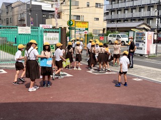 学校の中のいろいろな場所の温度を調べています。玄関のアスファルトは、少し風があったので31°Cでした。