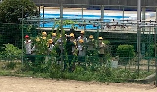 学習園でヘチマなどの観察をしています。日が照っていて暑そうです。気温は、何度あったのかな?