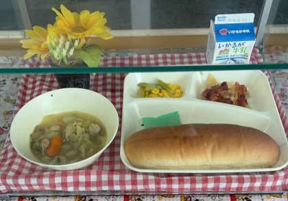 鶏肉とてぼ豆のスープ煮、じゃがいもとトマトのチーズ焼き、グリーンアスパラガスとコーンのサラダ、コッペパン、リンゴジャム、牛乳の組み合わせの給食が登場しました。
