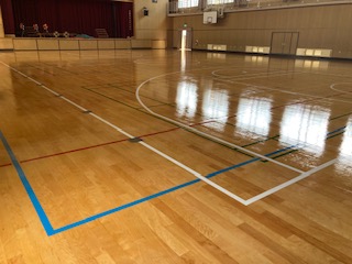 床を研磨し、ラインも張り替えてすっかりきれいになりました。ワックスなどの匂いはまだきつく、しばらく養生が必要です。