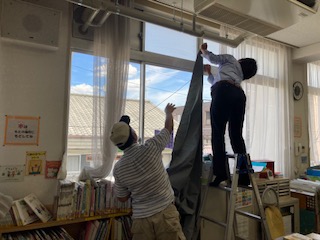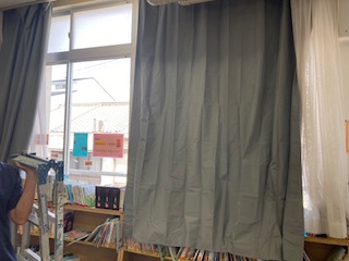4日夜、子ども会主催のイベント「ナイト図書館」が4年ぶりに開催されます。子ども会役員の方々が、光が漏れないように、図書館の北側窓にカーテンを取り付けてくださいました。