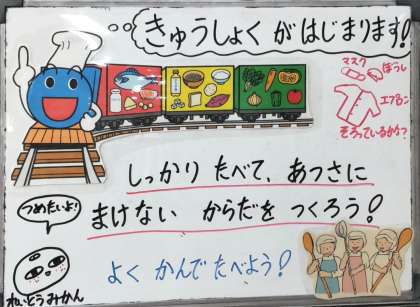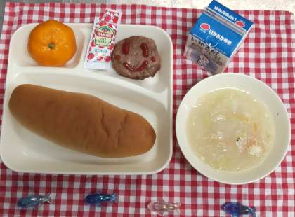 初日は食べやすいメニューで、焼きハンバーグ、豆乳スープ、冷凍みかん、黒糖パン、牛乳の組み合わせでした。