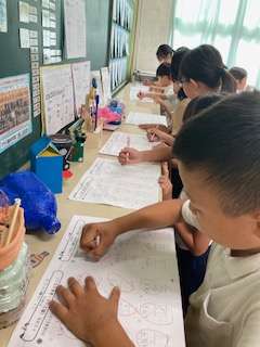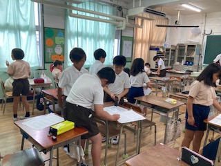朝学習のプリントの答え合わせをしています。友達と確かめ合う場面も見られました。