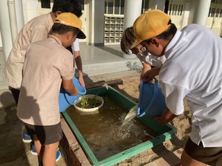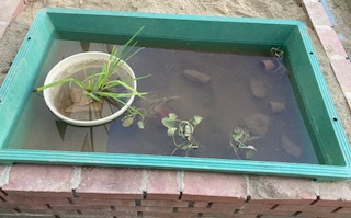 メダカや水草を入れて、ミニビオトープが完成しました!