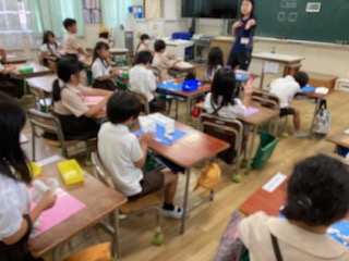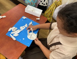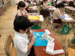 粘土で好きな物を作りました。出来上がった物を見せ合い、友達同士話が弾んでいます。
